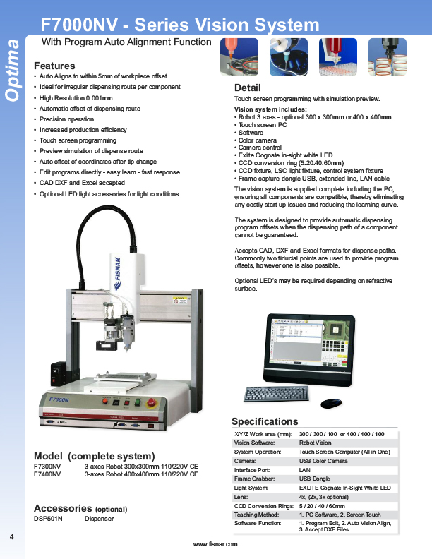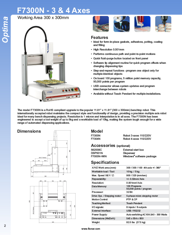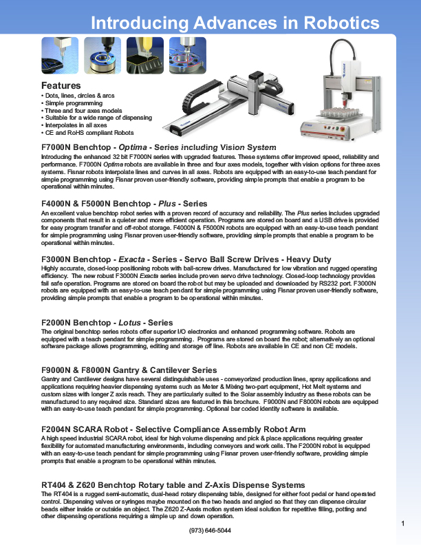 Fisnar is a manufacturing company dedicated to providing to all industries a cost-effective solution for the needs to dispense liquids and paste in a controlled manner. The goal is to provide "turn key" systems for a total solution.