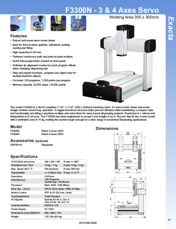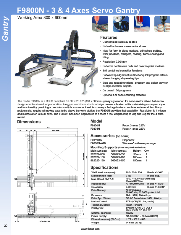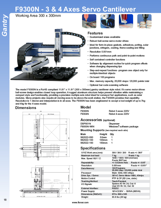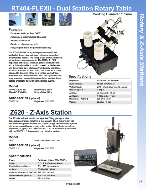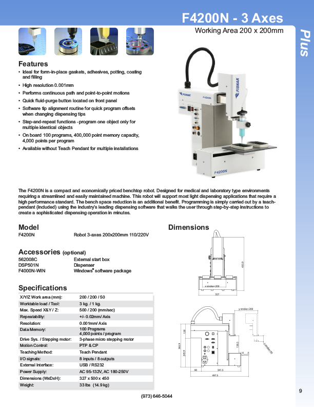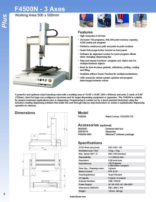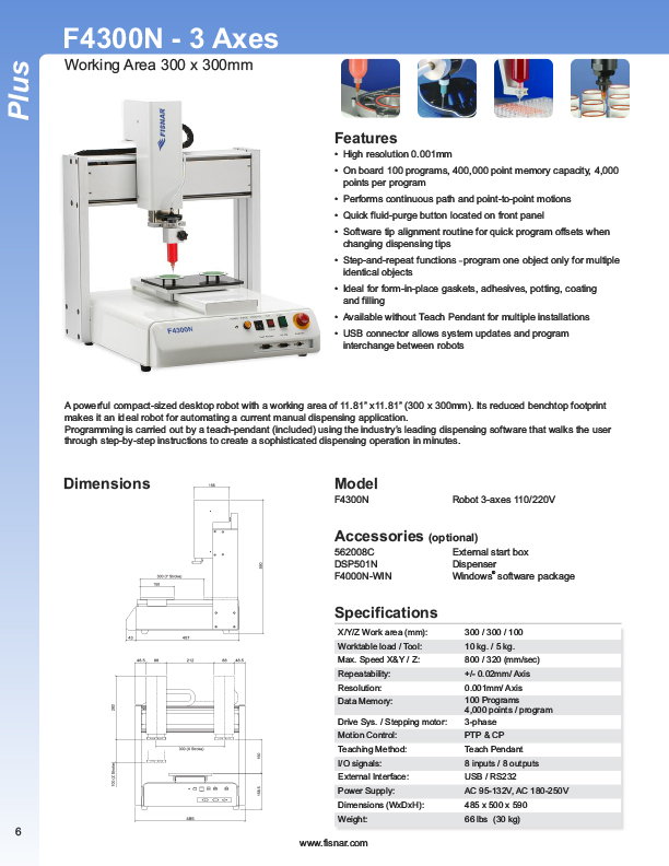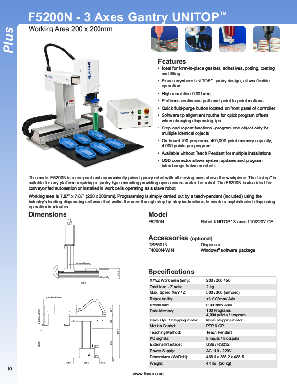 Fisnar has a complete line of Automatic Liquid Dispensers from the small hand-held syringe type units to valve controlled systems, programmable XYZ "robotic" systems. Precise application of assembly fluids ensures reduced rejects and high quality products. Included among these fluids are adhesives, instant glues, epoxies, silicones, solvents, marking inks, solder cream, solder paste, and various lubricants from oil to thick grease. Controlled, automatic deposits ensure reliable production and prevent waste and mess.