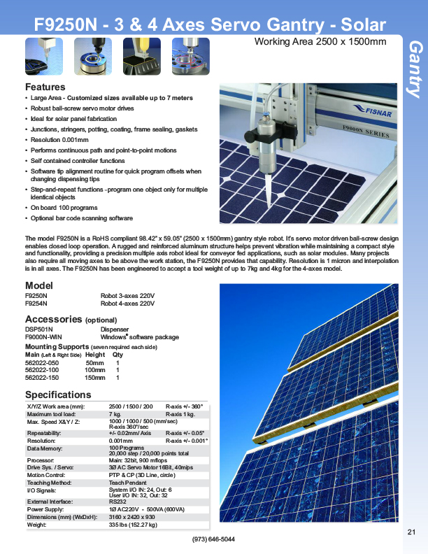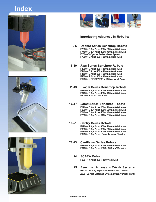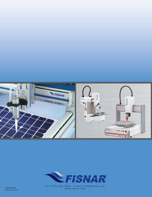 Fisnar is a manufacturing company dedicated to providing to all industries a cost-effective solution for the needs to dispense liquids and paste in a controlled manner. The goal is to provide "turn key" systems for a total solution.