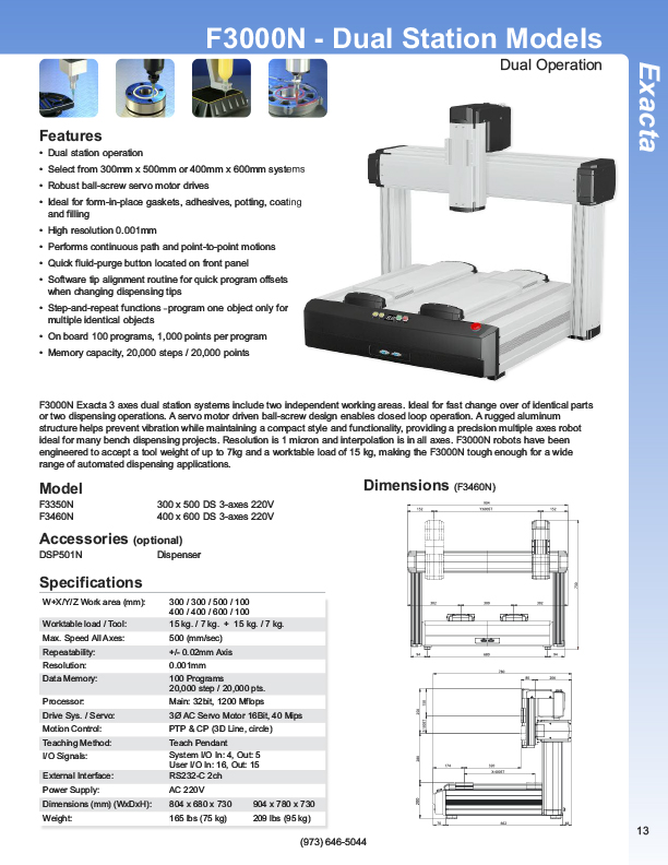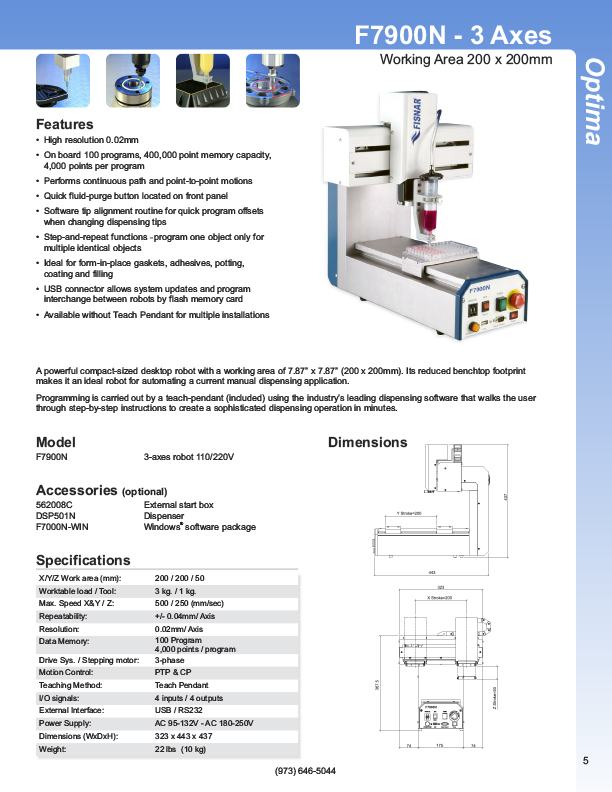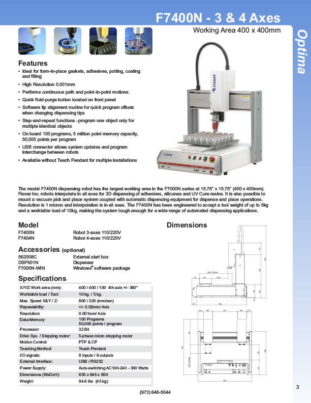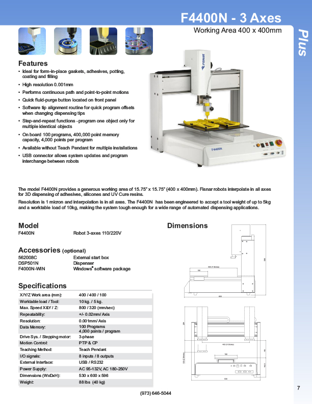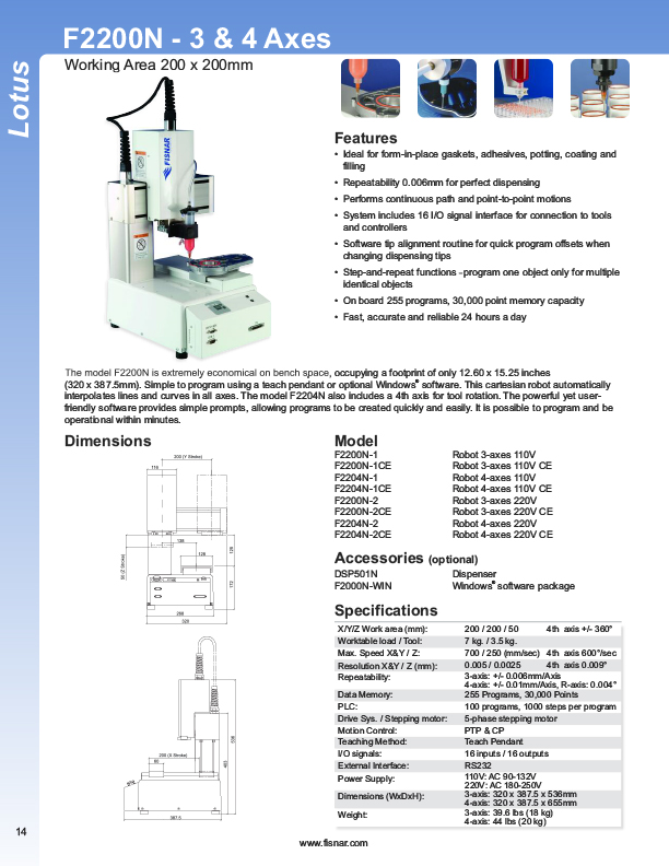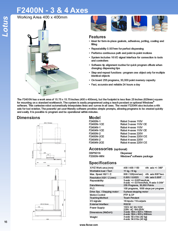 Fisnar has a complete line of Automatic Liquid Dispensers from the small hand-held syringe type units to valve controlled systems, programmable XYZ "robotic" systems. Precise application of assembly fluids ensures reduced rejects and high quality products. Included among these fluids are adhesives, instant glues, epoxies, silicones, solvents, marking inks, solder cream, solder paste, and various lubricants from oil to thick grease. Controlled, automatic deposits ensure reliable production and prevent waste and mess.